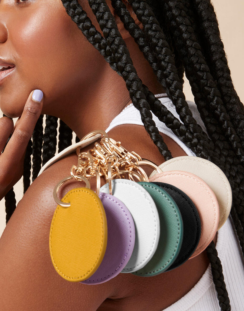The Boutique Circular Key Clip is a practical key chain made of high-quality polyurethane with a textured leather look (Saffiano). With its shiny metal clip, it's not only functional but also a stylish everyday accessory.