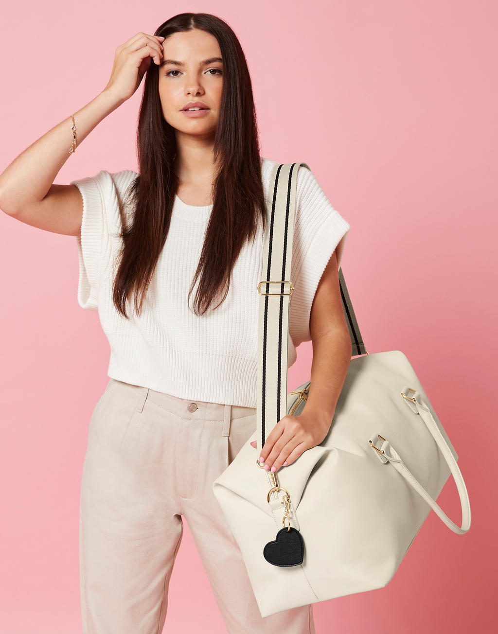 Die Tasche verfügt über praktische Tragegriffe und einen abnehmbaren, verstellbaren Schultergurt, sodass sie bequem in der Hand oder über der Schulter getragen werden kann. Das Hauptfach ist mit einem Reißverschluss ausgestattet und bietet ausreichend Platz für Kleidung, Schuhe und andere persönliche Gegenstände. Innen befindet sich eine zusätzliche Tasche mit Reißverschluss, um kleinere Dinge sicher zu verstauen.