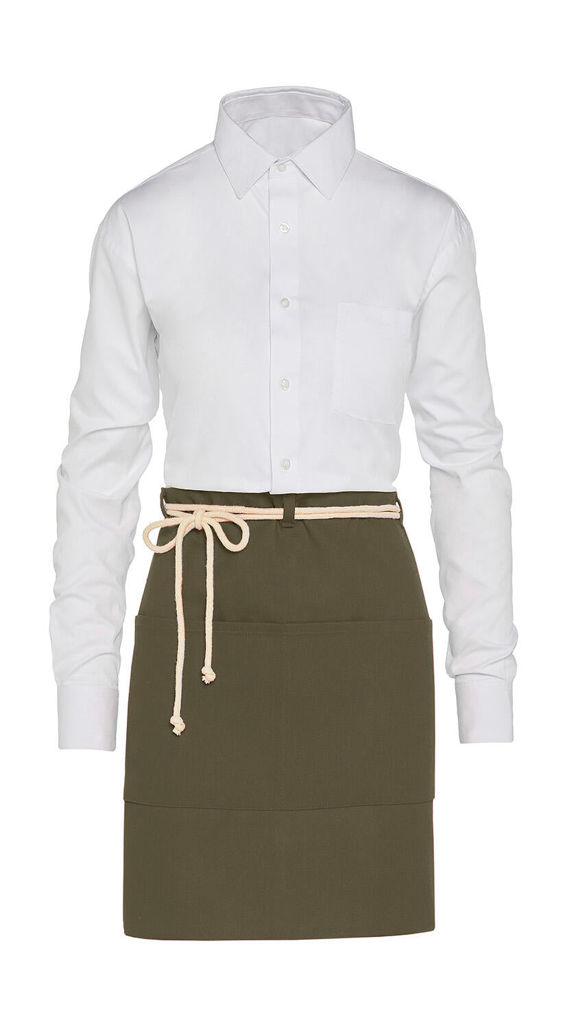 Die CORSICA Schürze ist aus 100% Baumwolle gefertigt und reaktiv gefärbt, um eine langanhaltende Farbechtheit zu gewährleisten. Sie verfügt über Gürtelschlaufen, an denen sie in der Taille mit Polycotton-Kordeln in der Farbe Natural gebunden wird. Dadurch kann die Schürze individuell an die Größe angepasst werden.