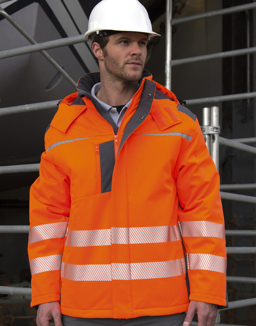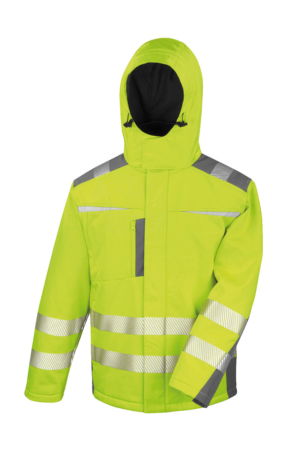 Der Dynamic SoftShell Coat erfüllt die EN ISO 20471:2013, Klasse 2, und ist somit ein zertifizierter Sicherheitsmantel. Er verfügt über eine Kapuze mit Trikotfutter und einem versteckten Klettverschluss im Kragen. Der Stehkragen sorgt für zusätzlichen Schutz vor Wind und Kälte.